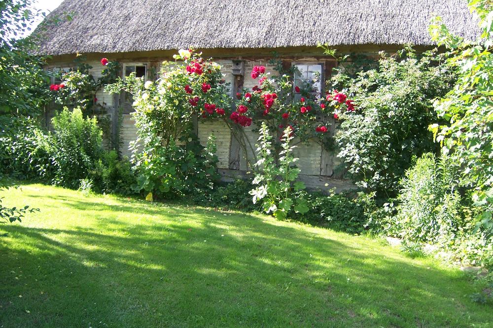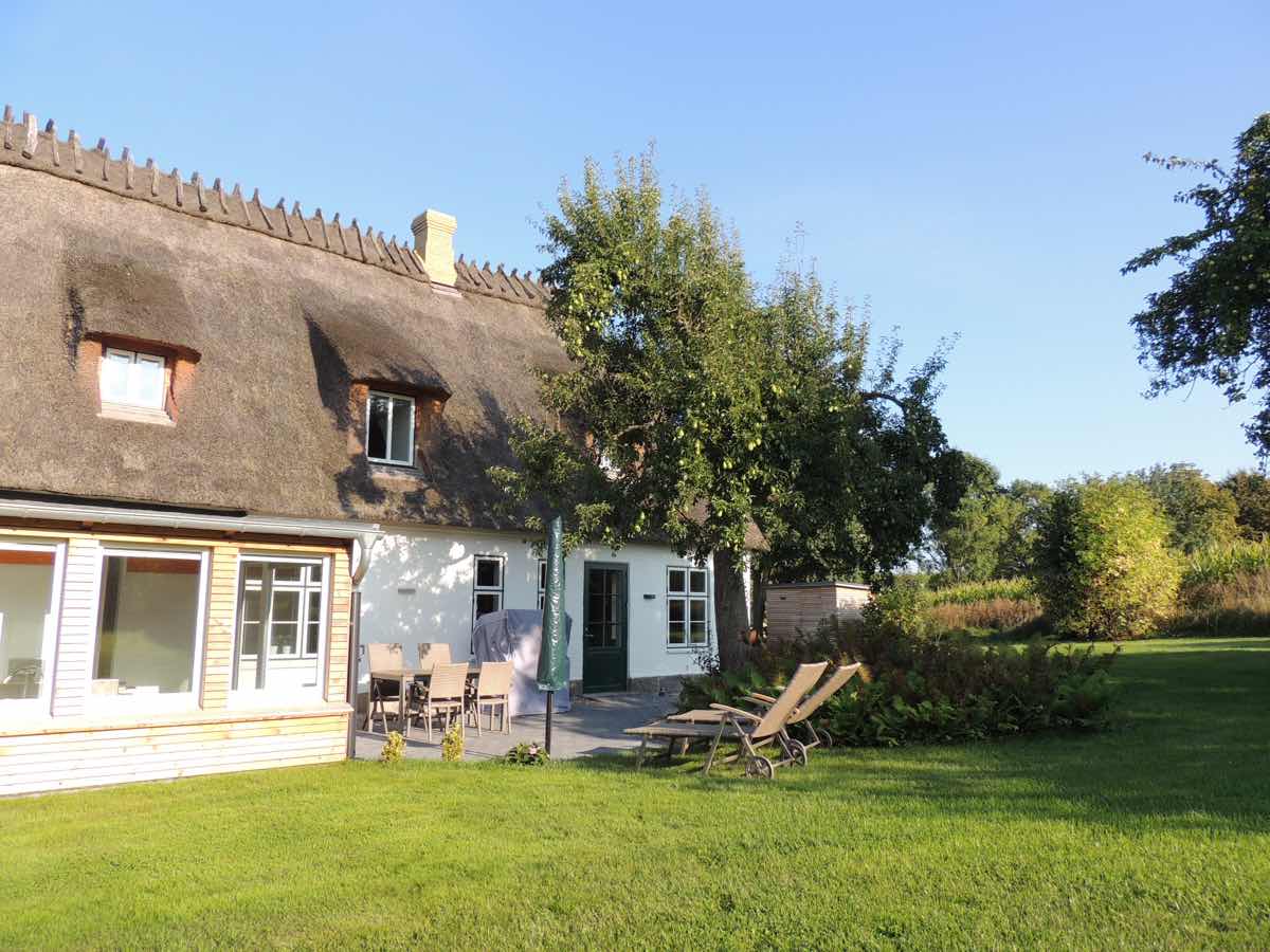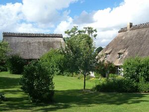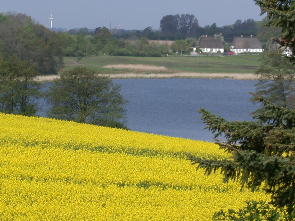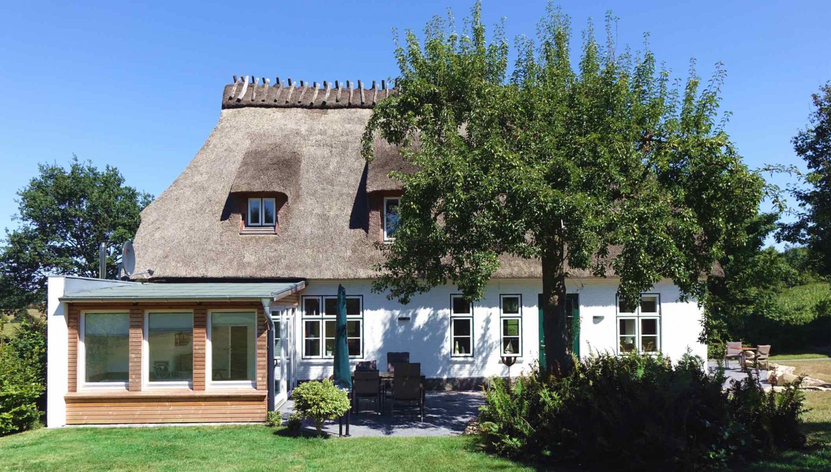 Inmitten der Angelner Landschaft befinden sich unsere zwei reetgedeckten Fachwerkhäuser und eine Fachwerkscheune auf einem 5.000m² großen Naturgrundstück, umgeben von Wiesen und Feldern.