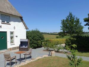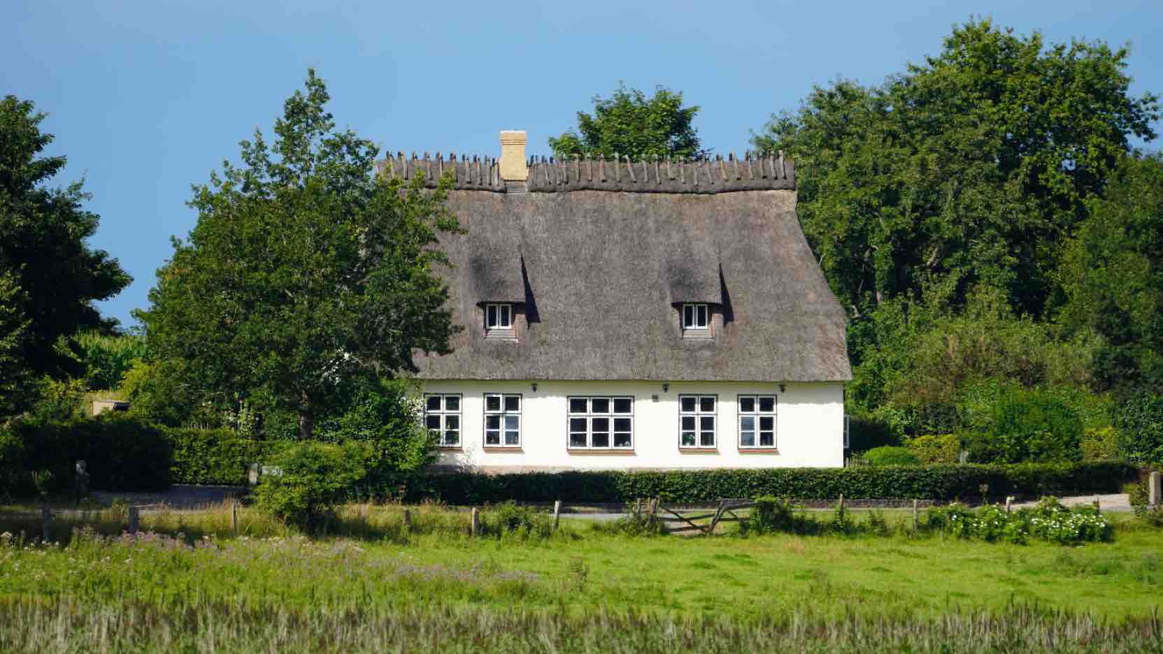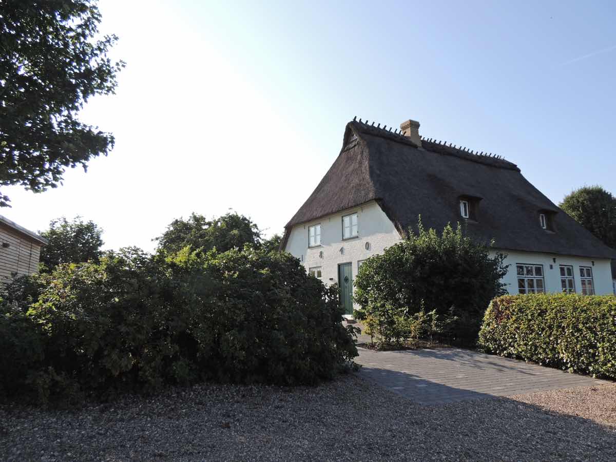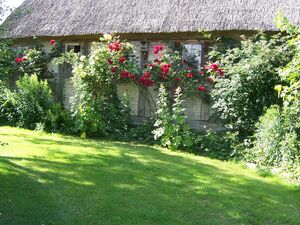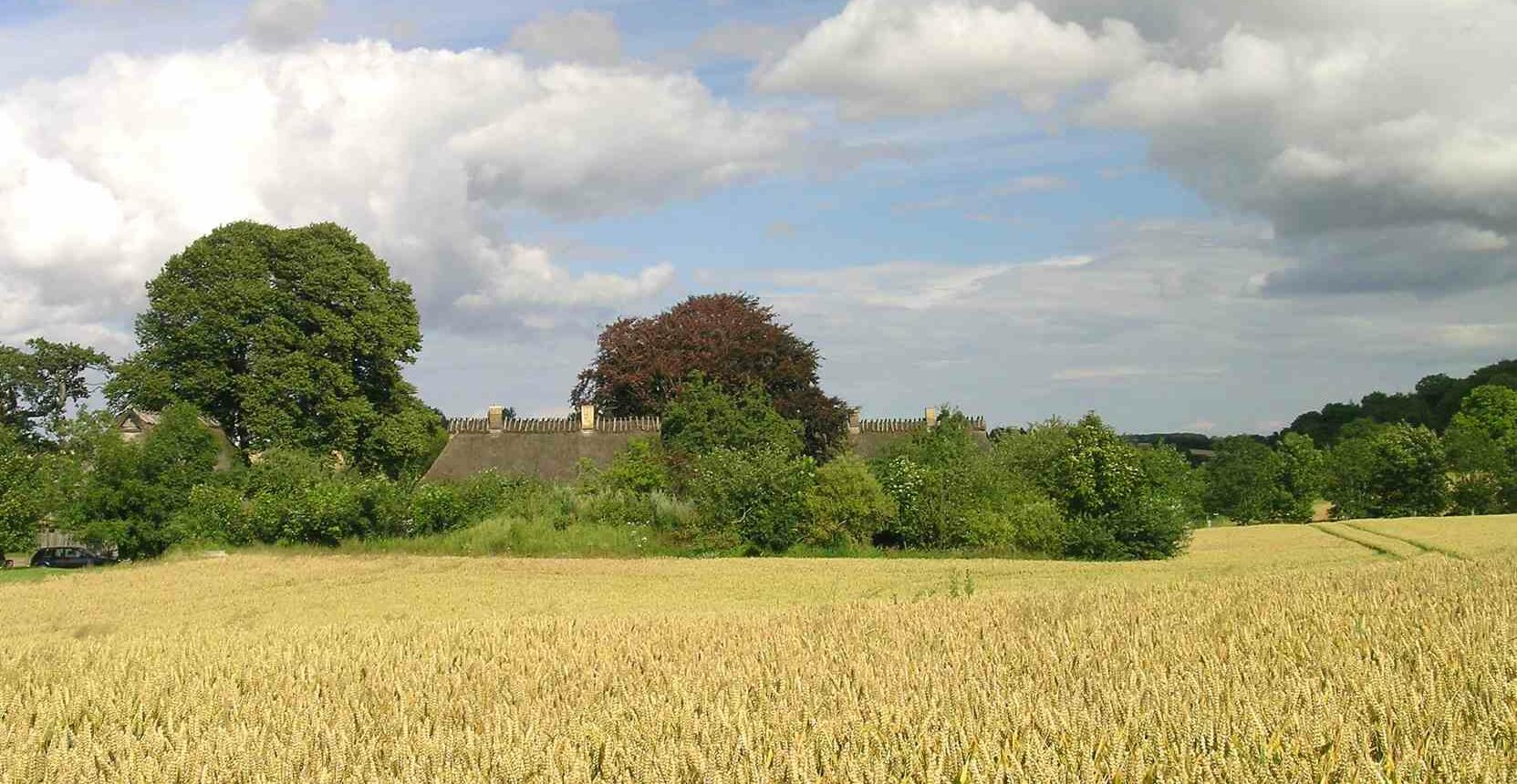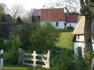 Inmitten der Angelner Landschaft befinden sich unsere zwei reetgedeckten Fachwerkhäuser und eine Fachwerkscheune auf einem 5.000m² großen Naturgrundstück, umgeben von Wiesen und Feldern.